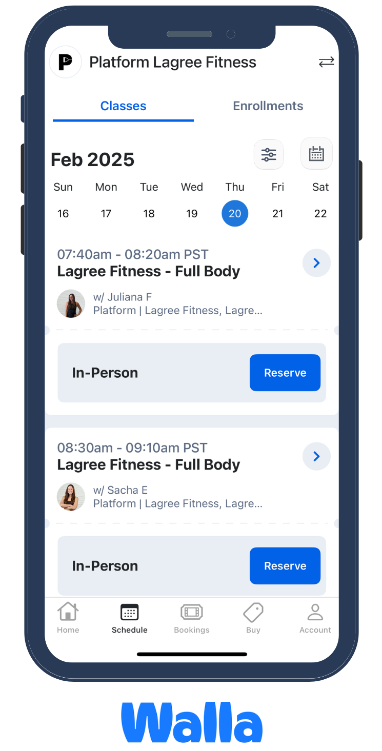 After booking your class and purchasing your package, download the Walla app to manage your schedule and book classes on the go!